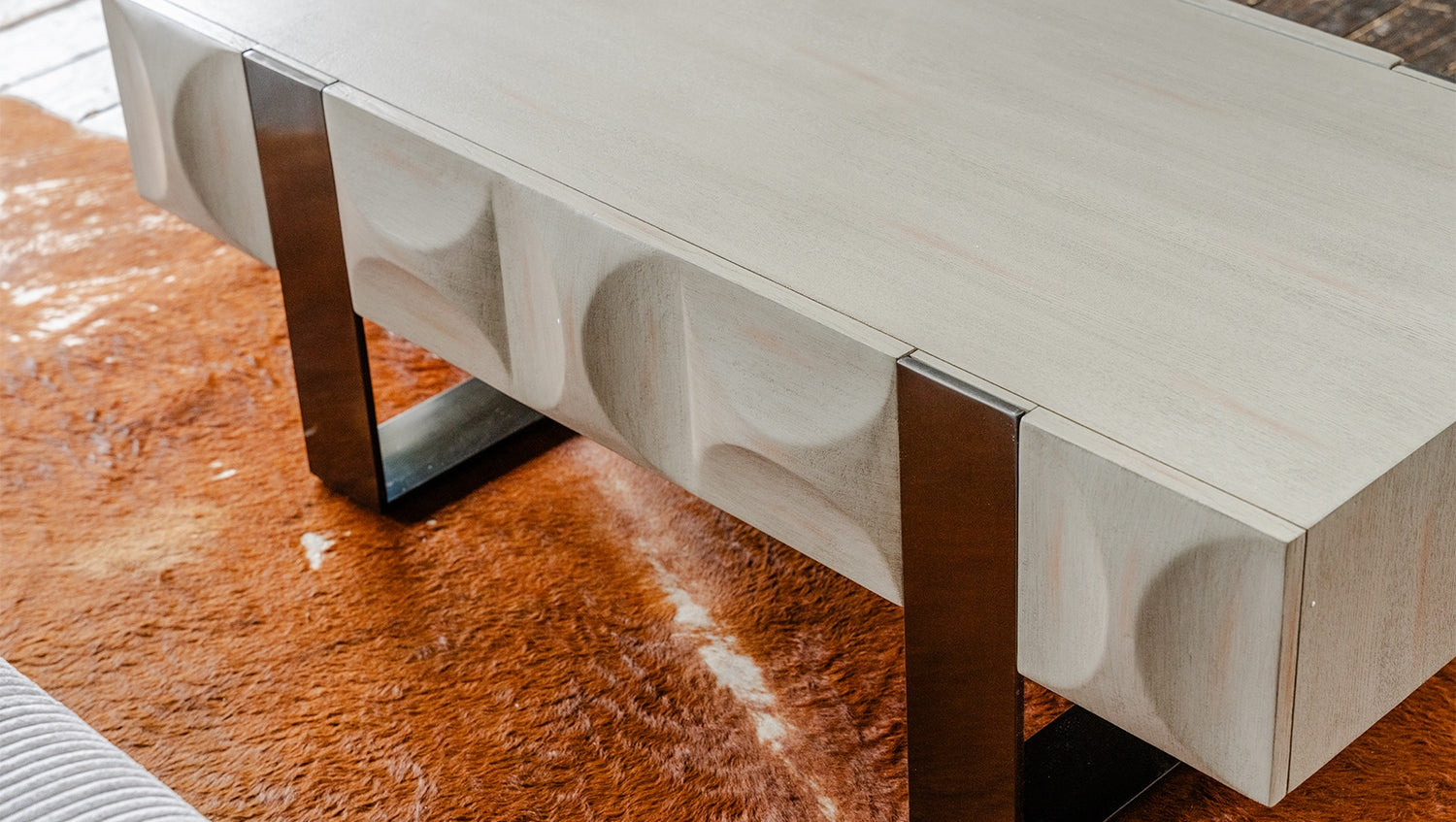 Das KAWOLA Lowboard MARGO besticht durch seine elegante Kombination aus modernem Design und praktischer Funktionalität. Es eignet sich auch ideal als Couchtisch oder Beistelltisch. Der Korpus und die Schublade sind stilvoll mit hochwertigem grauen Ulmenholz furniert, das dem Möbelstück eine luxuriöse Optik verleiht. Die eine Schublade bietet großzügigen Stauraum und lässt sich dank des Muldengriffes an der Oberseite mühelos öffnen. Die silberfarbenen Kufenfüße aus gebürstetem Edelstahl sorgen für einen modernen, zeitlosen Look und bieten gleichzeitig stabile Standfestigkeit. Das Lowboard MARGO von KAWOLA fügt sich perfekt in jedes Wohnambiente ein und ist ideal für Liebhaber von ausgefallenen, aber dennoch eleganten Möbelstücken. Entdecken Sie die perfekte Kombination aus Design und Funktionalität mit dem Lowboard MARGO!