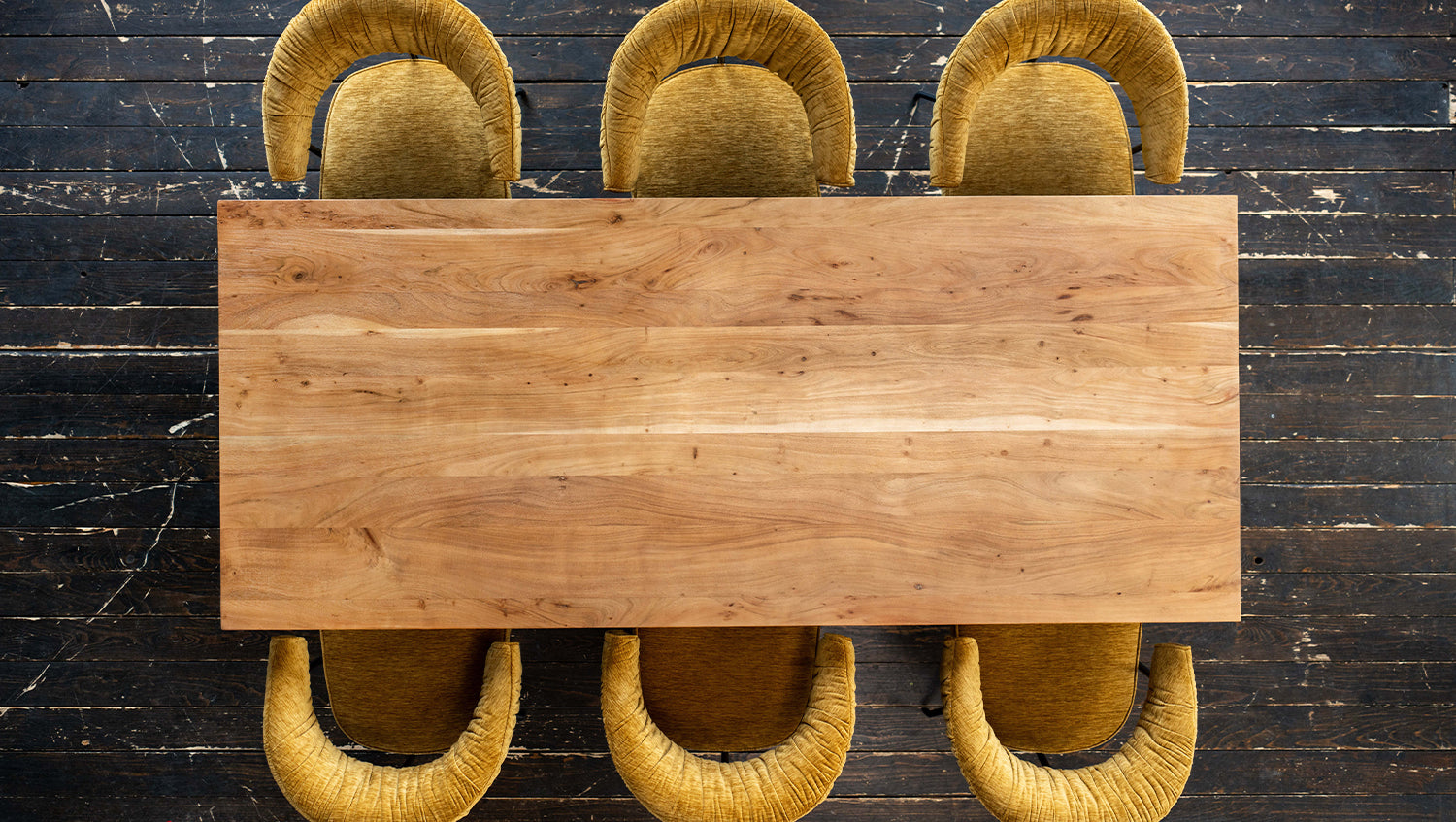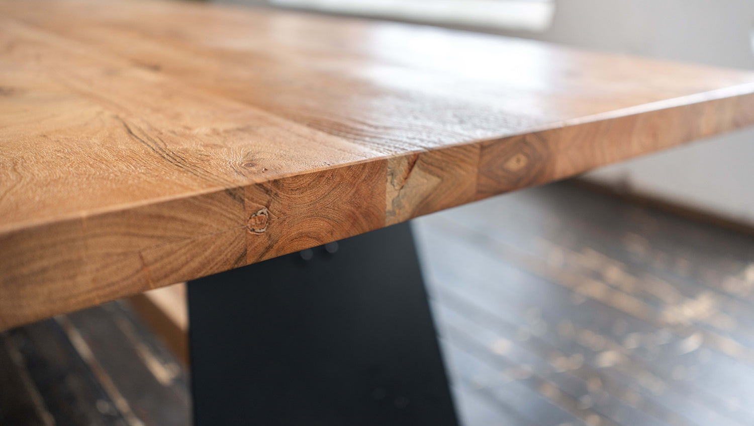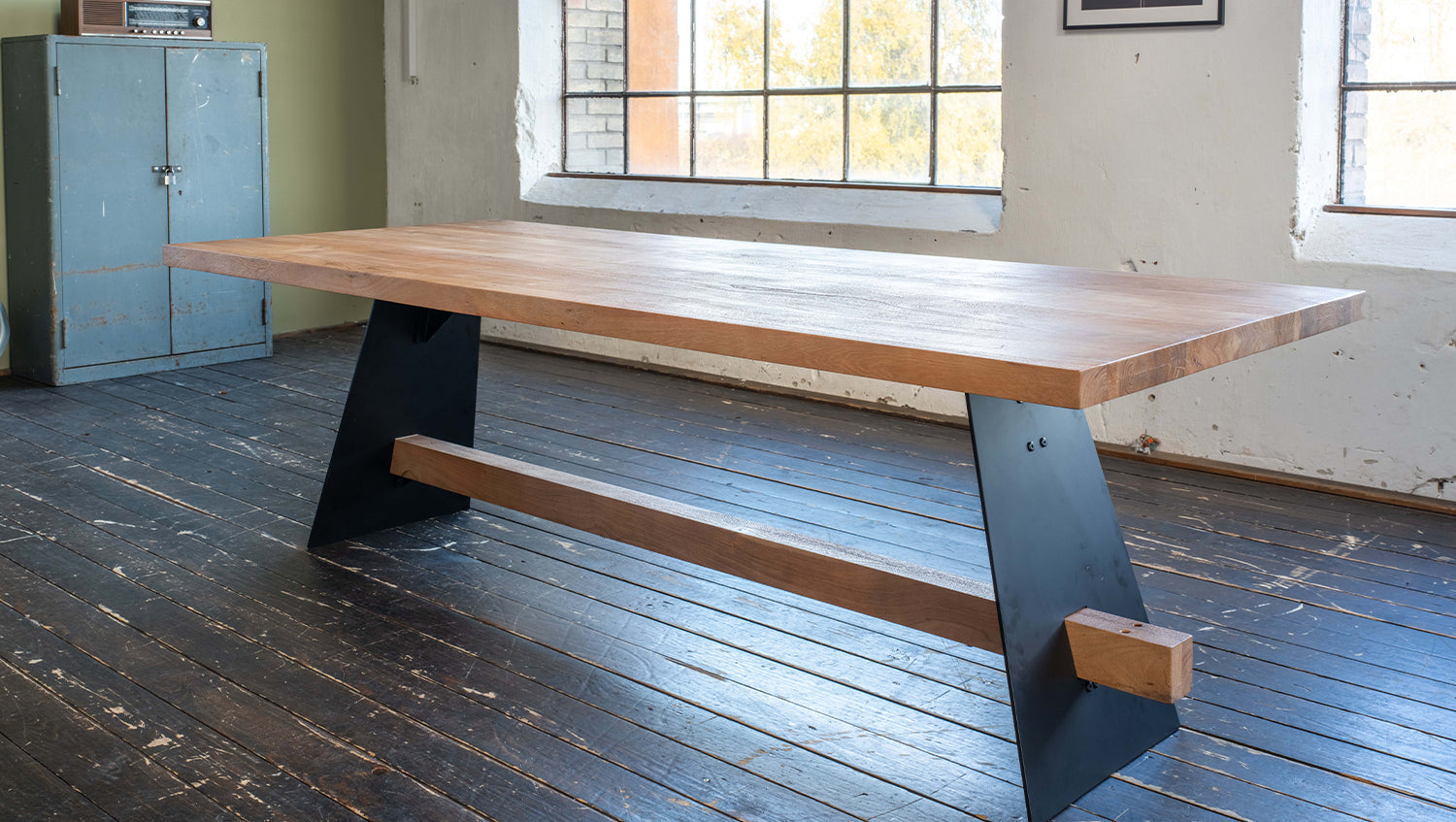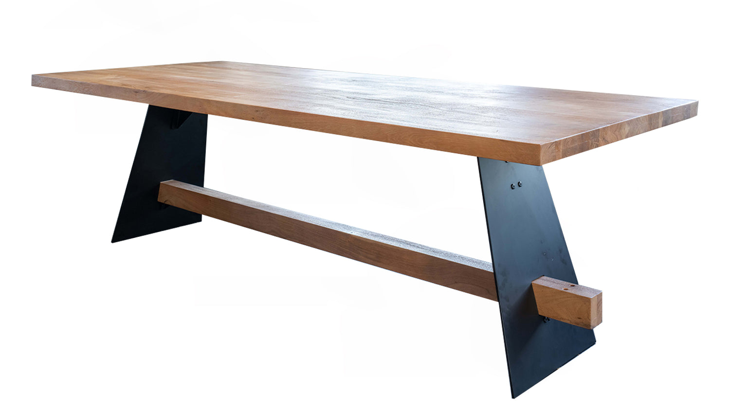Das rustikal geschweißte, schwarz lackierte Untergestell im Industriedesign verleiht dem Tisch eine moderne, industrielle Note. Diese gelungene Kombination aus natürlichem Holz und robustem Metall macht den Tisch zu einem Design-Highlight in Ihrem Esszimmer.