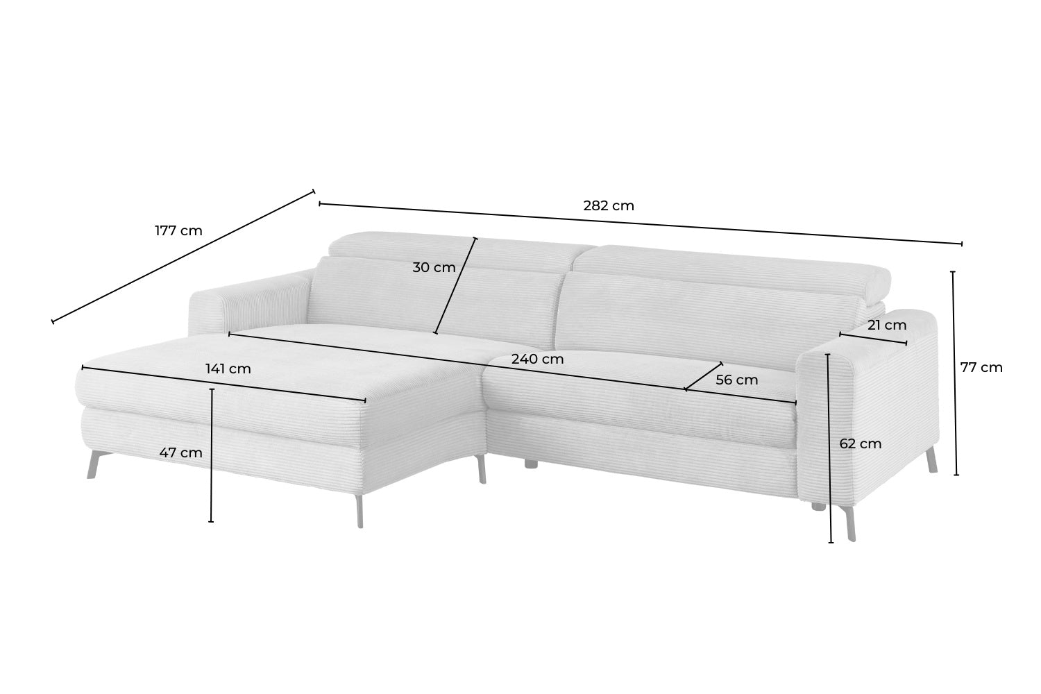 Mit einer großzügigen Breite von 282 cm bietet LAISKA ausreichend Platz zum Entspannen. Die weiche Polsterung garantiert höchsten Komfort, während die manuell einstellbaren Kopfteile sich individuell anpassen lassen – für perfekten Halt in jeder Position.