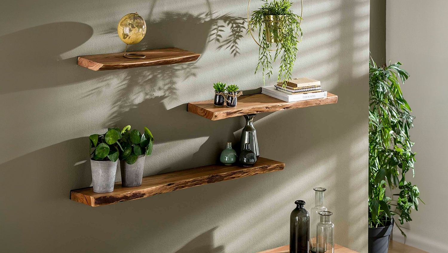 Das KAWOLA Wandregal ERGEA ist ein 120 cm breites Regal aus massivem Akazienholz, das mit einem matten, transparenten Lack veredelt ist. Die Enden des Regals sind in einer robusten, geschliffenen Baumstammform gehalten, was für ein natürliches und gleichzeitig rustikales Aussehen sorgt. Dank des verdeckten Regalträgers wird das Regal unsichtbar an der Wand befestigt und scheint dadurch zu schweben.