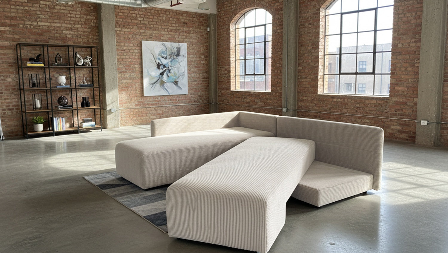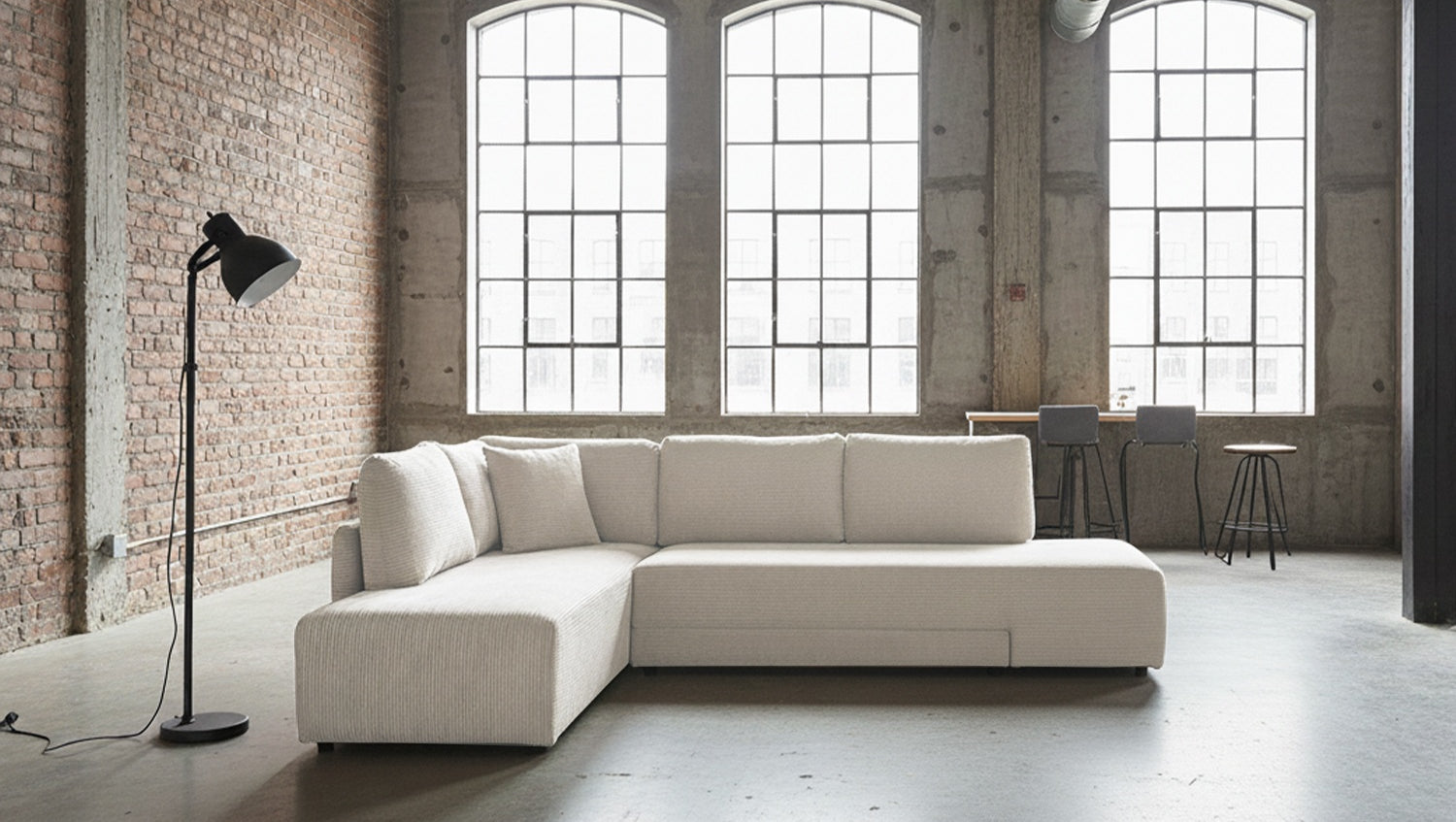 • Modernes Schlafsofa in Eckform mit klarer, zeitloser Linienführung