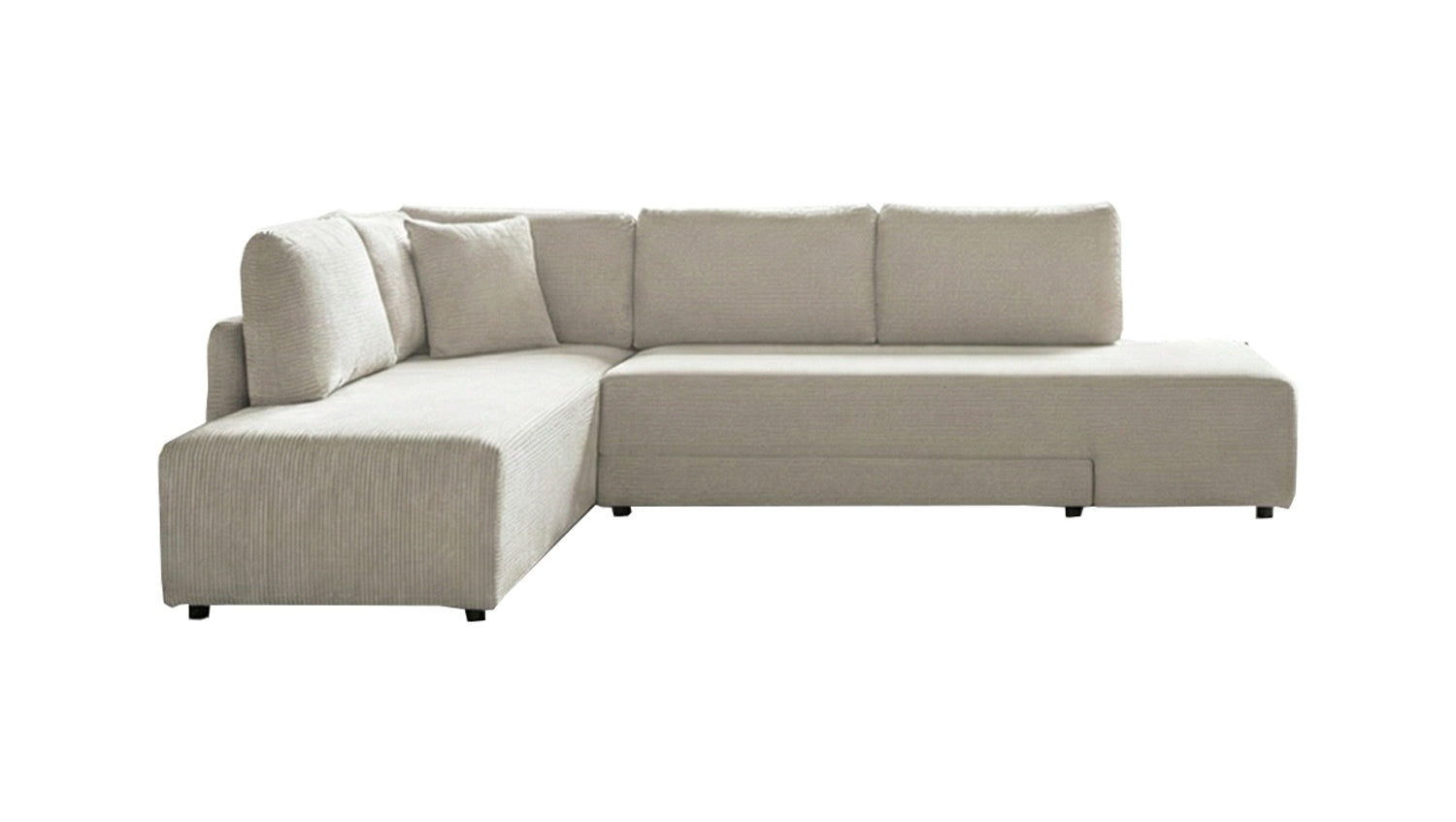 Das Schlafsofa und Ecksofa SADIRA von KAWOLA vereint großzügigen Wohnkomfort, eine durchdachte Schlaffunktion und ein modernes, wohnliches Design. Der weiche Cord-Bezug verleiht dem Sofa eine besonders gemütliche Ausstrahlung und sorgt für eine angenehme Haptik, die zum Entspannen einlädt. Durch die klare Linienführung, die bodennahe Optik und die voluminösen Polster fügt sich SADIRA harmonisch in moderne Wohnkonzepte ein und wird schnell zum Mittelpunkt des Raumes. Die großzügige Ecklösung bietet viel Platz für entspannte Abende, geselliges Beisammensein oder ruhige Momente. Mit wenigen Handgriffen lässt sich das Sofa in eine komfortable Liegefläche verwandeln. Die durchgehende Polsterung sorgt dabei für ein gleichmäßiges Liegegefühl und macht SADIRA zu einer idealen Lösung für Gäste oder den regelmäßigen Gebrauch als Schlafsofa. Der Cord-Bezug unterstreicht den wohnlichen Charakter zusätzlich und vermittelt Wärme und Behaglichkeit. Zum Lieferumfang gehören insgesamt sechs Kissen, darunter zwei speziell als Schlafkissen geeignete Kissen, die sowohl tagsüber als auch nachts für zusätzlichen Komfort sorgen. Mit einer Gesamtbreite von 288 cm und einer großzügigen Ottomane von  209 cm bietet SADIRA viel Raum zum Sitzen, Liegen und Schlafen. Die Rückenlehnenhöhe von 89 cm unterstützt eine entspannte Sitzposition und trägt zum hohen Komfort bei. SADIRA mit Cord-Bezug ist die perfekte Wahl für alle, die ein modernes Schlafsofa suchen, das Gemütlichkeit, Funktionalität und stilvolles Design auf überzeugende Weise miteinander verbindet.